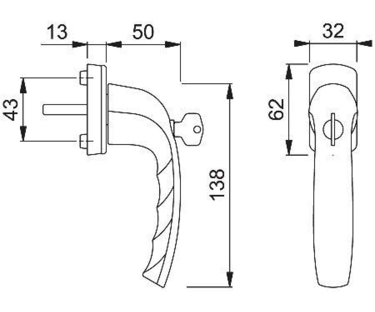 Weitere technische Eigenschaften · Grifflänge: 138mm · Nocken-Ø: 10mm · Lochabstand: 43mm · Sockelstärke: 13mm · Vierkant: 7mm · Fenstergriff NY · 0810SVS/U10 · Alu.F9016/verkehrsweiß ·