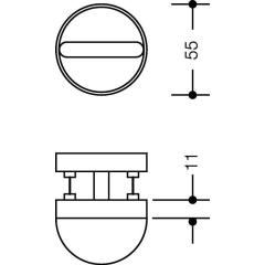 WC-Rosettenpaar · Polyamid durchgängig eingefärbt · Rosettenunterkonstruktion aus Kunststoff · DIN links und DIN rechts verwendbar · Verdeckte, lockerungssichere Verschraubung mit 5 mm Spaxschrauben und in das Türblatt eintauchenden Stützdehnzapfen · WC-Ausführung mit Schauscheibe (Anzeige rot/weiß) und Notöffnung mittels Münze (FBM) auf der Außenseite, Riegelolive auf der Innenseite · Rosetten-Abdeck-Kappe, rund, Durchmesser 55 mm, 10,5 mm hoch, 1,5 mm Wandstärke · für TS 38,1 - 48,0 mm · Edition matt