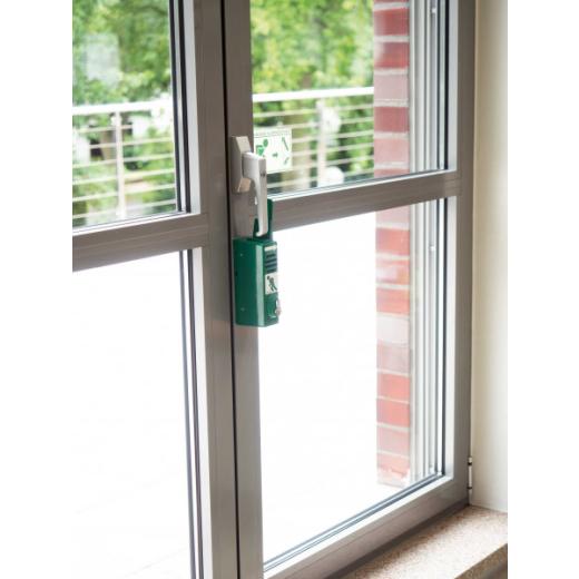 für alle Fenster · durch Seitwärtsschwenken des Fenstergriffes ertönt ein lauter Alarmton 95 dB/1 m · kann mit dem Geräteschlüssel um 180 Grad gedreht werden, Dauerfreigabe z.B. zum Lüften · aus Metall (Zinkdruckguss) · grün lackiert (RAL 6029) · Profilhalbzylinder · 9 V Batterie · in Übereinstimmung mit der DIN EN 179 · hohe Hemmschwelle gegen Missbrauch · Klebeplatte optional für einfache, bohrlochfreie Montage